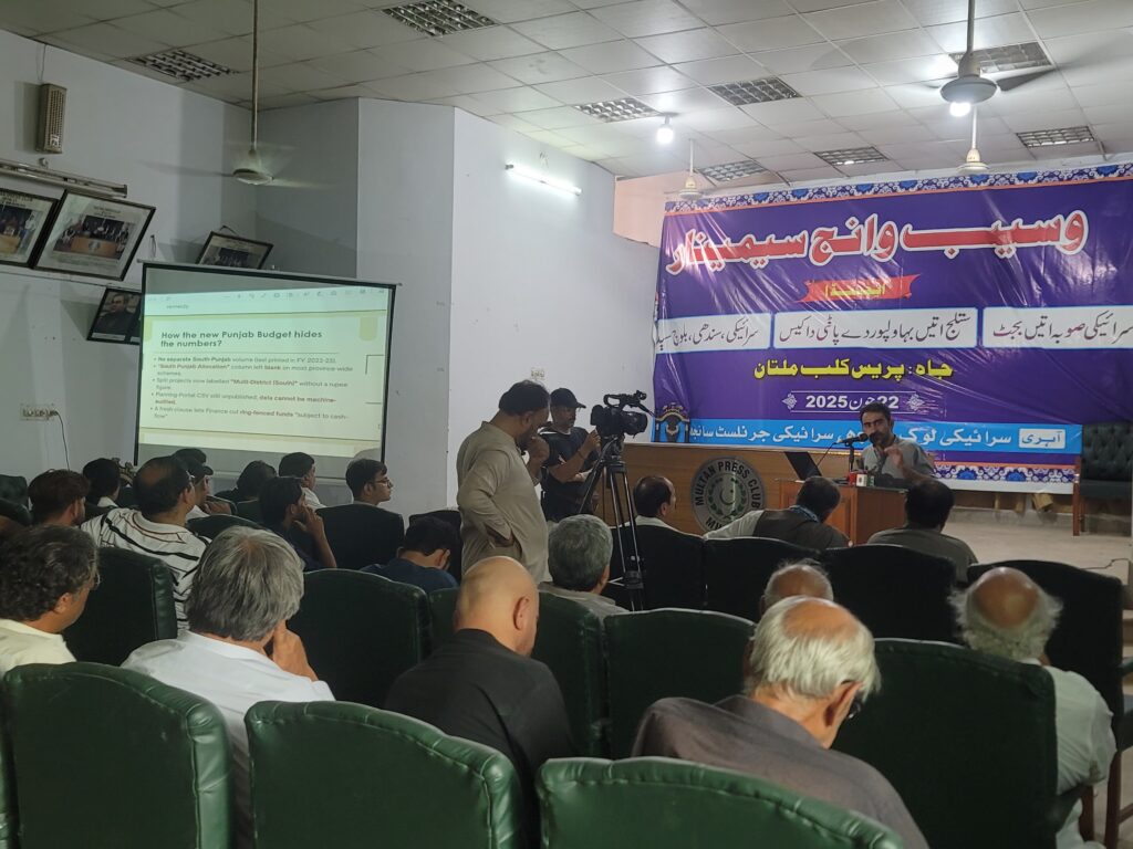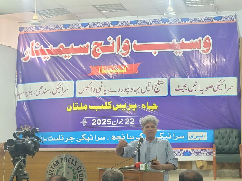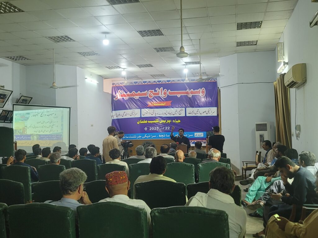 Multan: 22-06-2025 The people of Siraiki Wasaib—including students, journalists, lawyers, intellectuals, artists, activists – gathered at seminar organised by Siraiki Lok Saanjh have issued a powerful declaration condemning Punjab’s oppressive policies, discriminatory share of Siraiki Wasaib in Punjab’s Budget 2025-26, demanding immediate steps toward the creation of a separate Siraiki province. The declaration exposes decades of economic exploitation, cultural erasure, and political disenfranchisement under what they describe as Punjab’s “internal colonialism.”