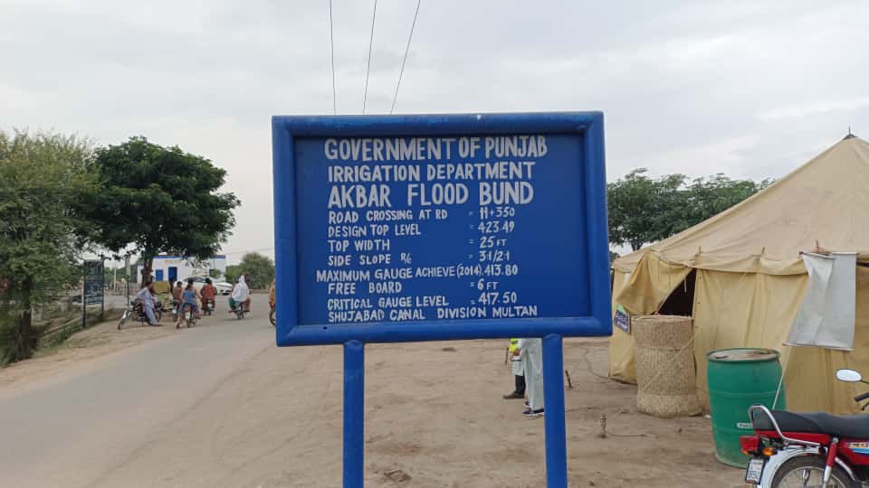 The River Chenab swelled to a maximum gauge of 414 feet at Muhammad Wala Road, Akbar Bund, Multan, on September 4, 2025—a height not seen in more than a decade. A signboard still stands there, reminding passersby that in 2014 the river had peaked at 413.80 feet, forcing the authorities to breach the road in order to release the pressure.